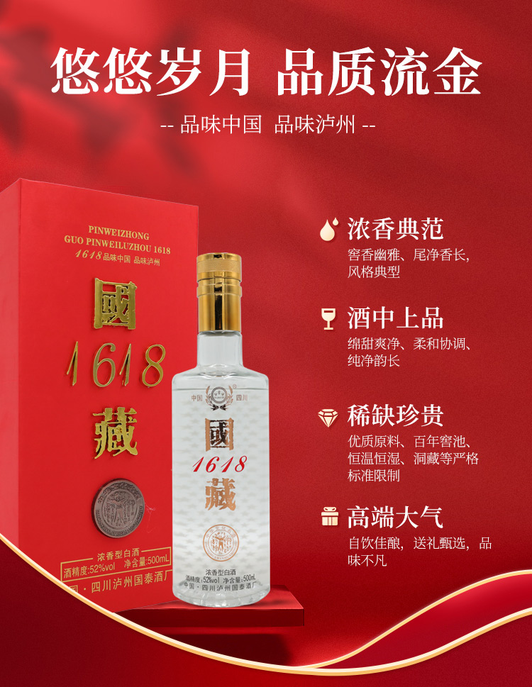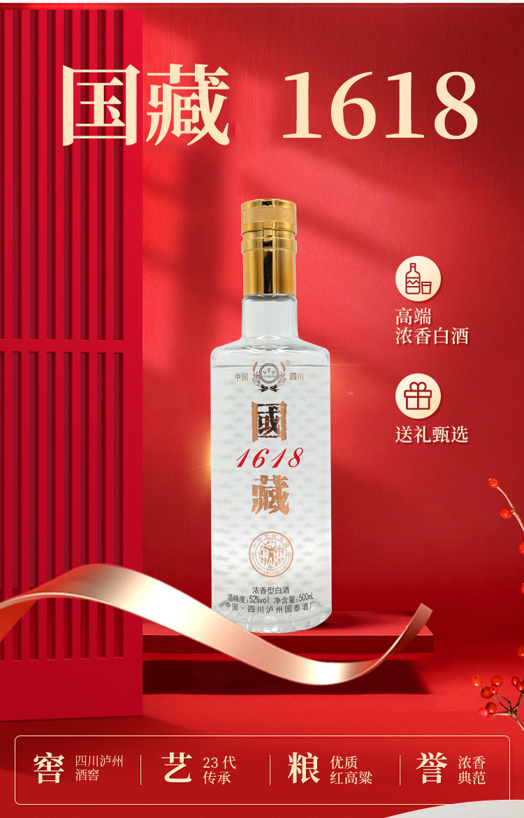 泸州国泰 国藏1618 52度 浓香型白酒 纯粮酿造口粮酒 500ml*6瓶 整箱