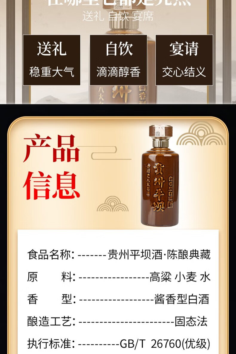 平坝(PING BA)【贵州老八大名酒】 平坝酱酒 精品陈酿 53度 酱香型白酒 优级酒 500mL*6瓶 整箱