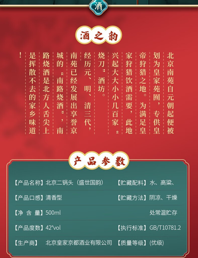 京都北京二锅头 盛世国韵 42度 优级清香白酒 500ml*6瓶 整箱