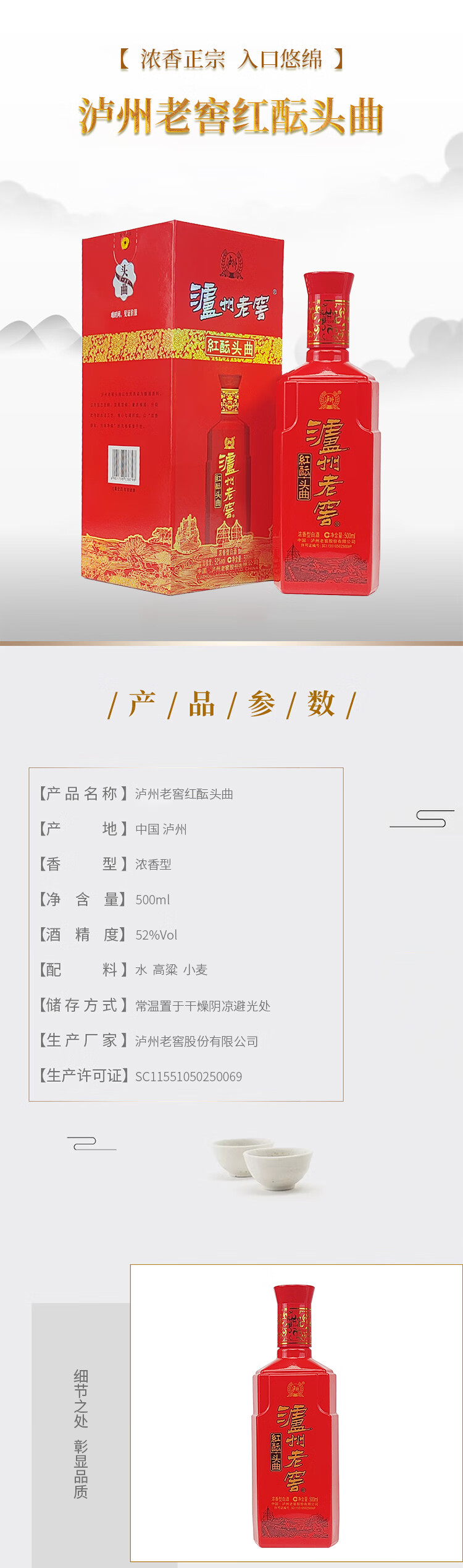 泸州老窖 红酝头曲 52度 浓香型白酒 纯粮酿造 500ml*6瓶 整箱
