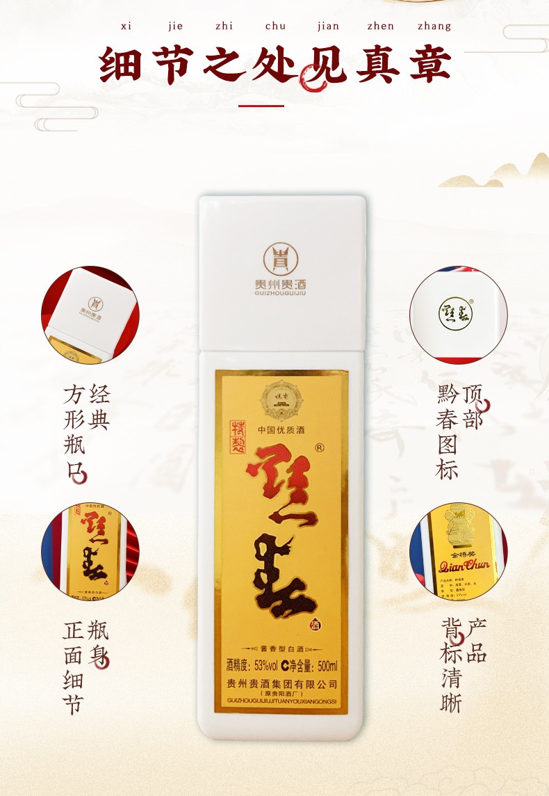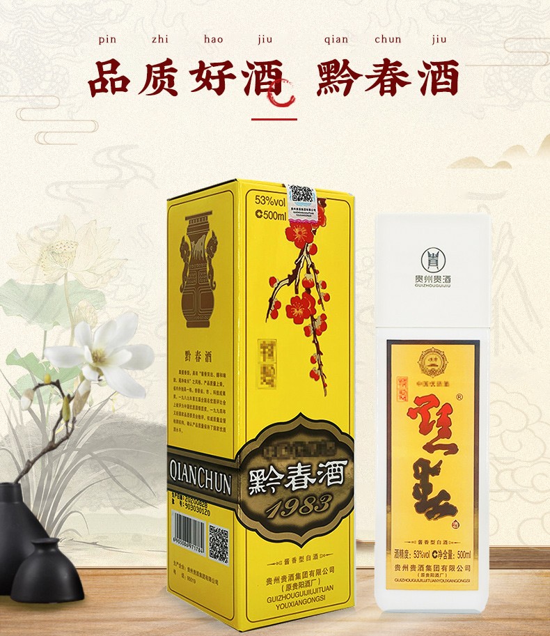 黔春酒 1983黄盒方瓶 酱香型白酒 53度 500ml*6瓶 整箱装