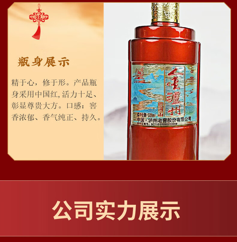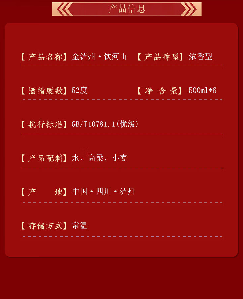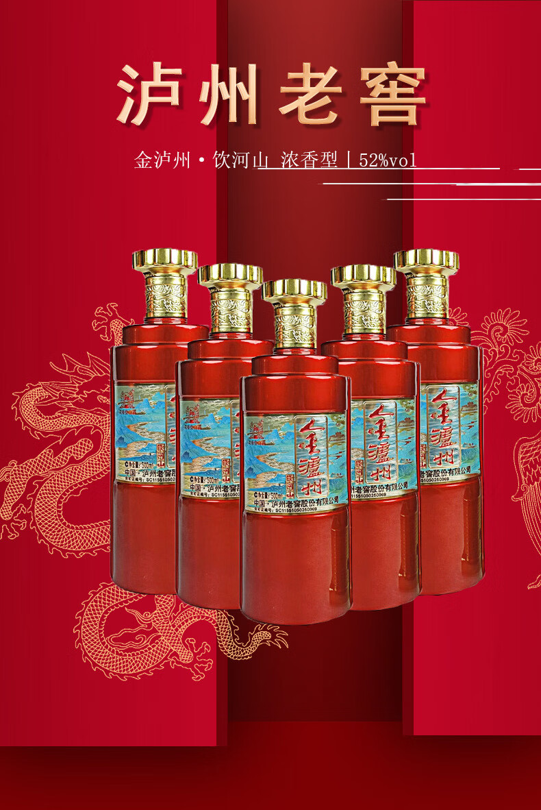 泸州泸州老窖股份出品 52度 浓香型 高度白酒口粮酒喜酒商务送礼酒水 金泸州 饮河山52度 500ml*6瓶