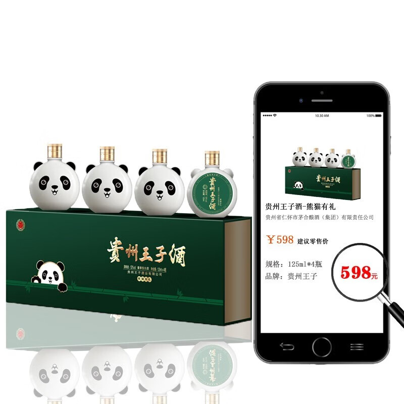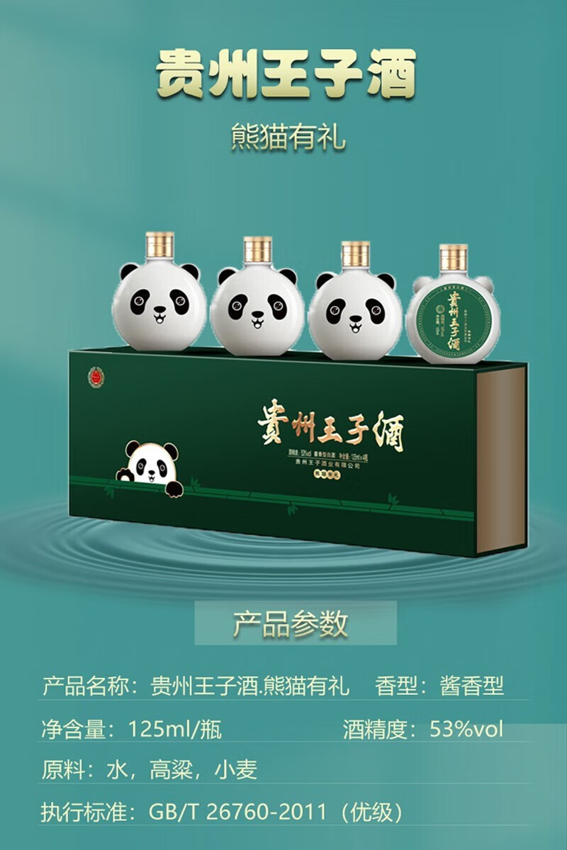 贵州王子酒 53度酱香型白酒 贵州茅台镇酱酒 粮食酿造 熊猫有礼125ml*4瓶 礼盒装