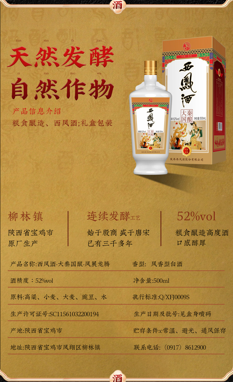 西凤 绵柔凤香型白酒 52度 大秦国酿 凤展龙腾 500ml*6瓶 整箱装