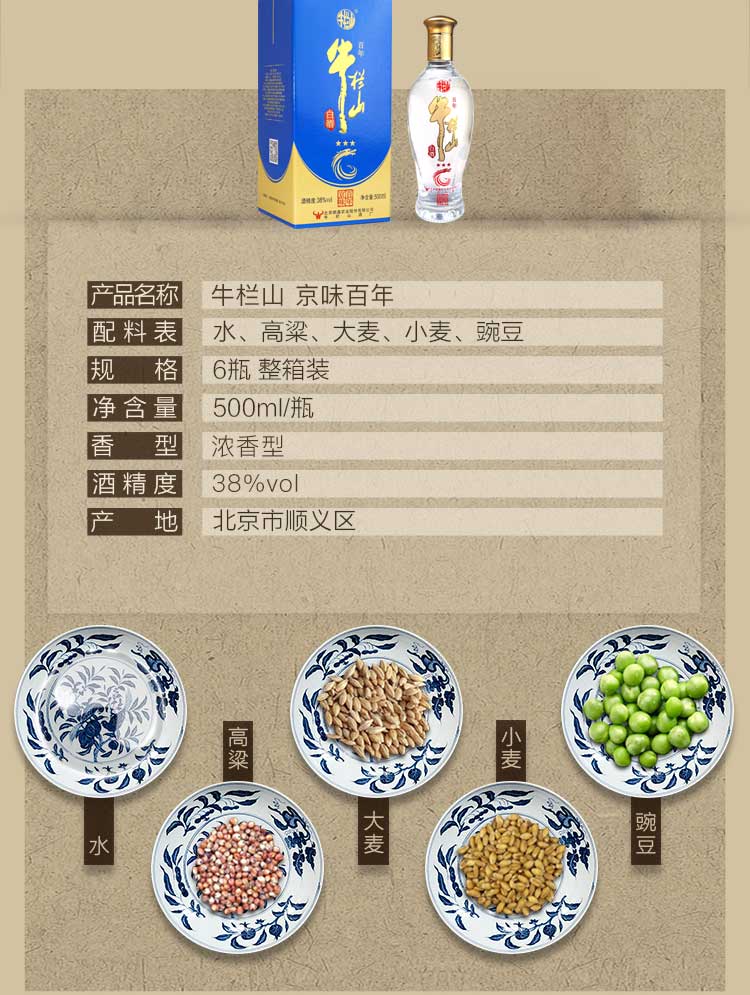 百年牛栏山 二锅头 京味百年 三星 38%VOL 浓香型白酒 500ml*6瓶 整箱装