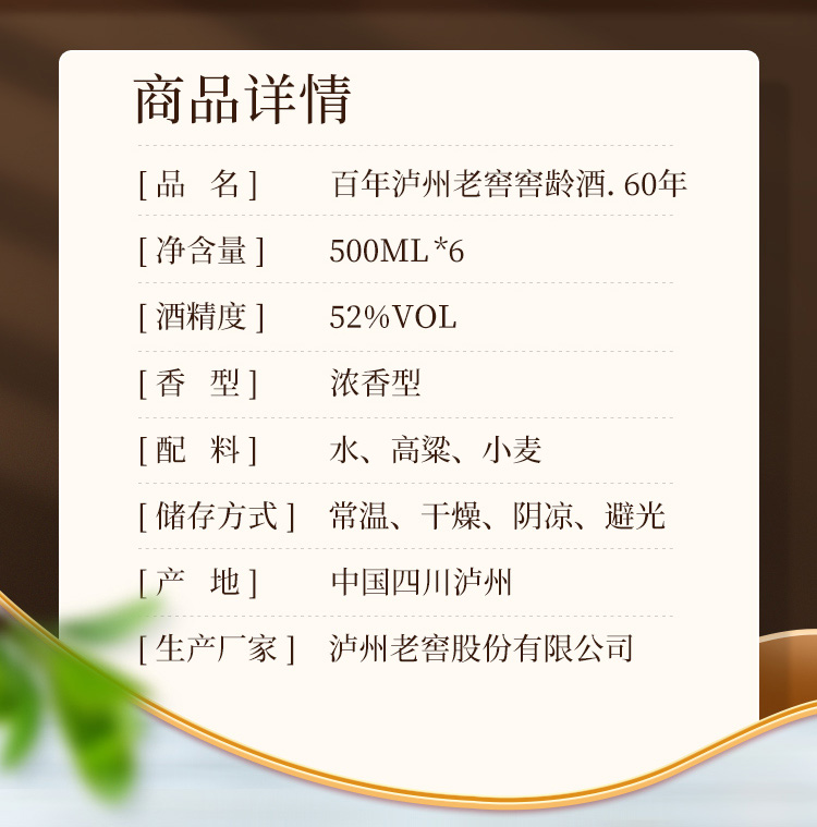 百年泸州老窖 窖龄60年 浓香型白酒 52度 500ml*6瓶 整箱