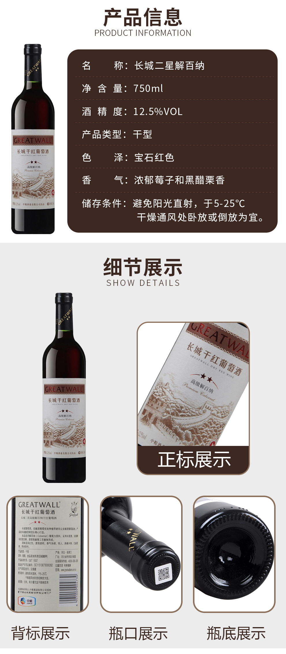 TJL 长城(GreatWall)红酒 中粮长城干红葡萄酒 长城星级系列 长城二星高级解百纳12.5%VOL 750ml*6瓶 易损物品 默认拆箱发