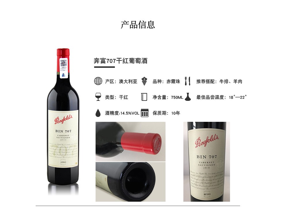 TJL 奔富红酒Penfolds干红葡萄酒澳大利亚原瓶原装进口 奔富707 14.5%VOL 750ML*6支装