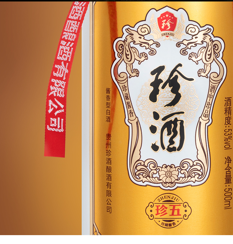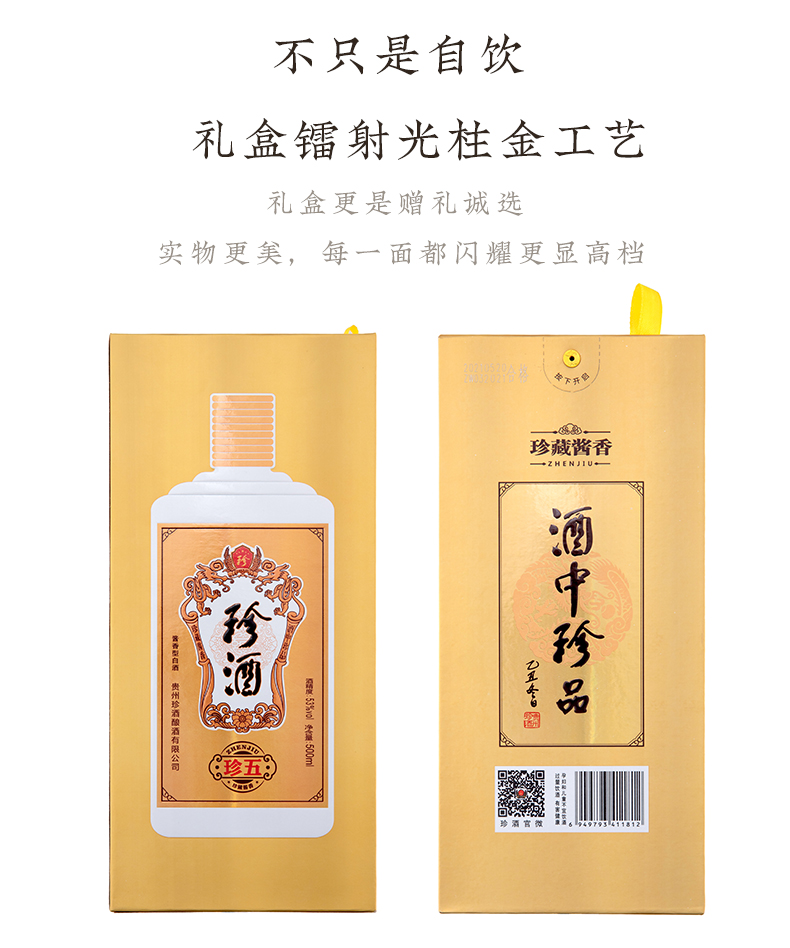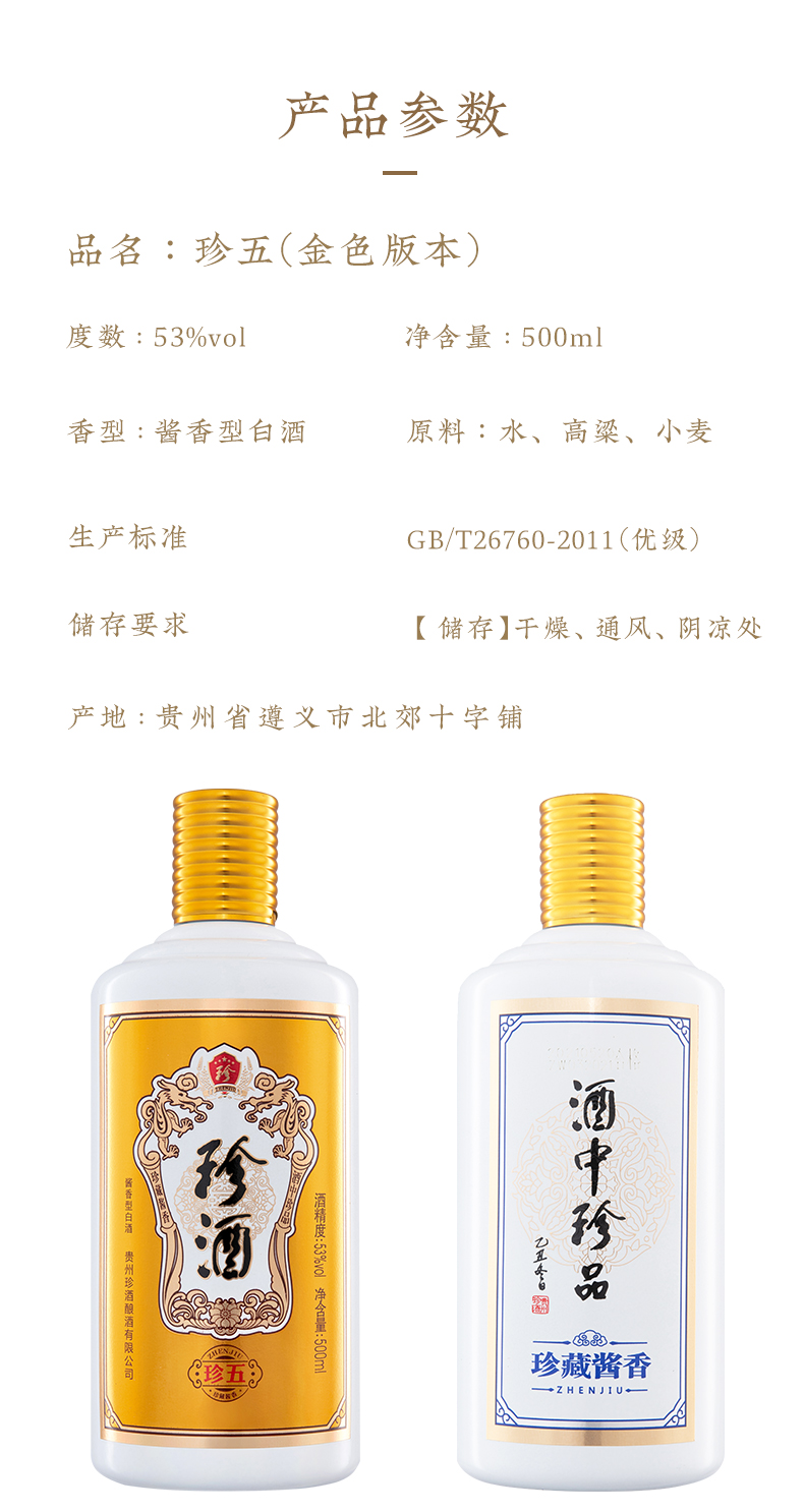 WYB 贵州珍酒(ZHENJIU) 珍五 金装版 53度 酱香型白酒 500ml*6 整箱装 酒中珍品 珍藏酱香 大曲坤沙 纯粮酿造