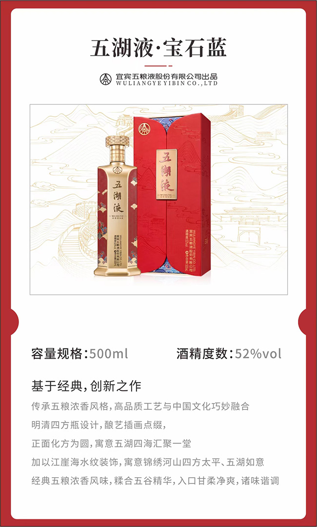 宜宾五粮液股份公司 五湖液宝石蓝 52度 浓香型 高度白酒 500ml*6瓶 整箱装