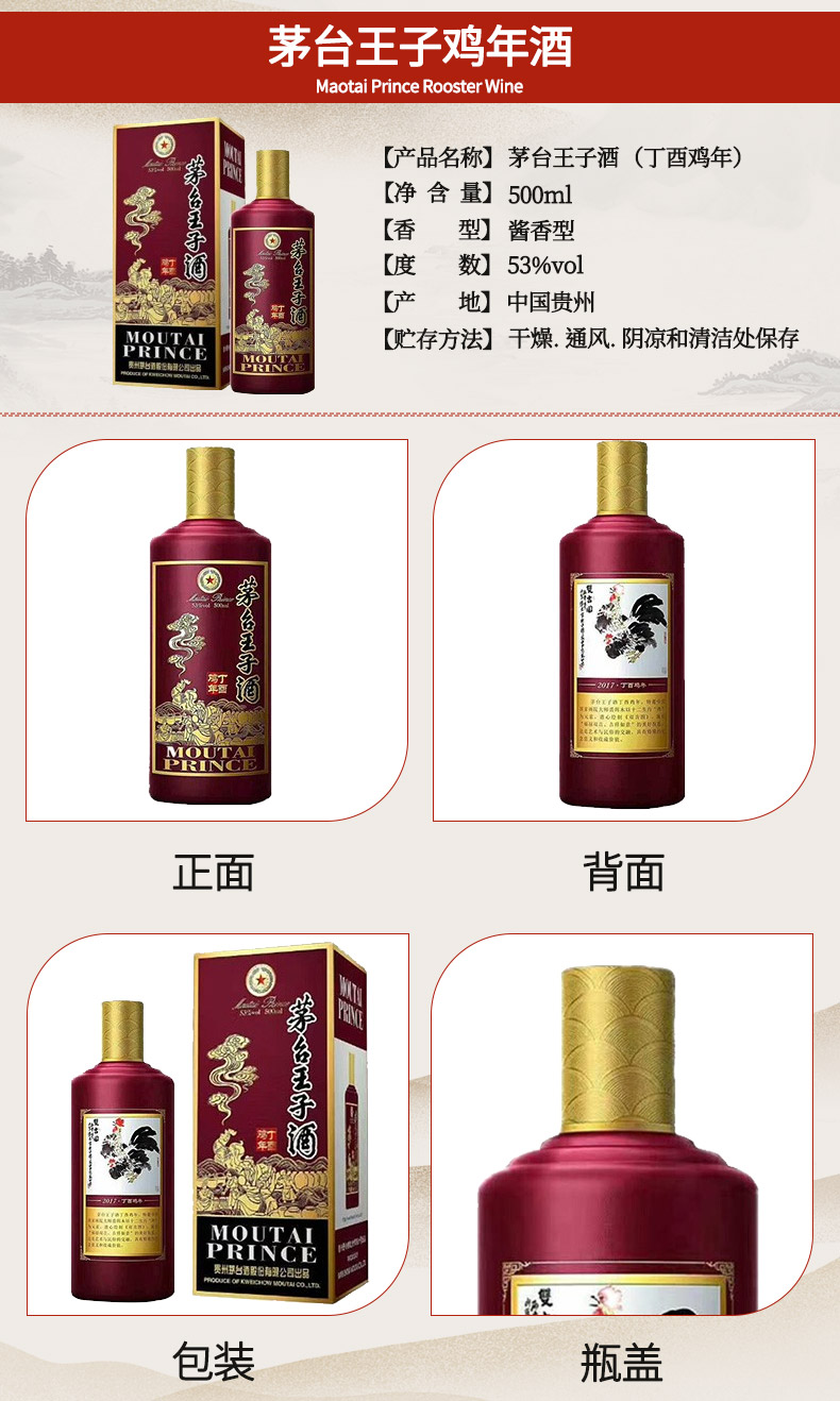 茅台王子酒生肖酒(丁酉鸡年)53度 酱香型高度白酒 500ML*6 整箱装