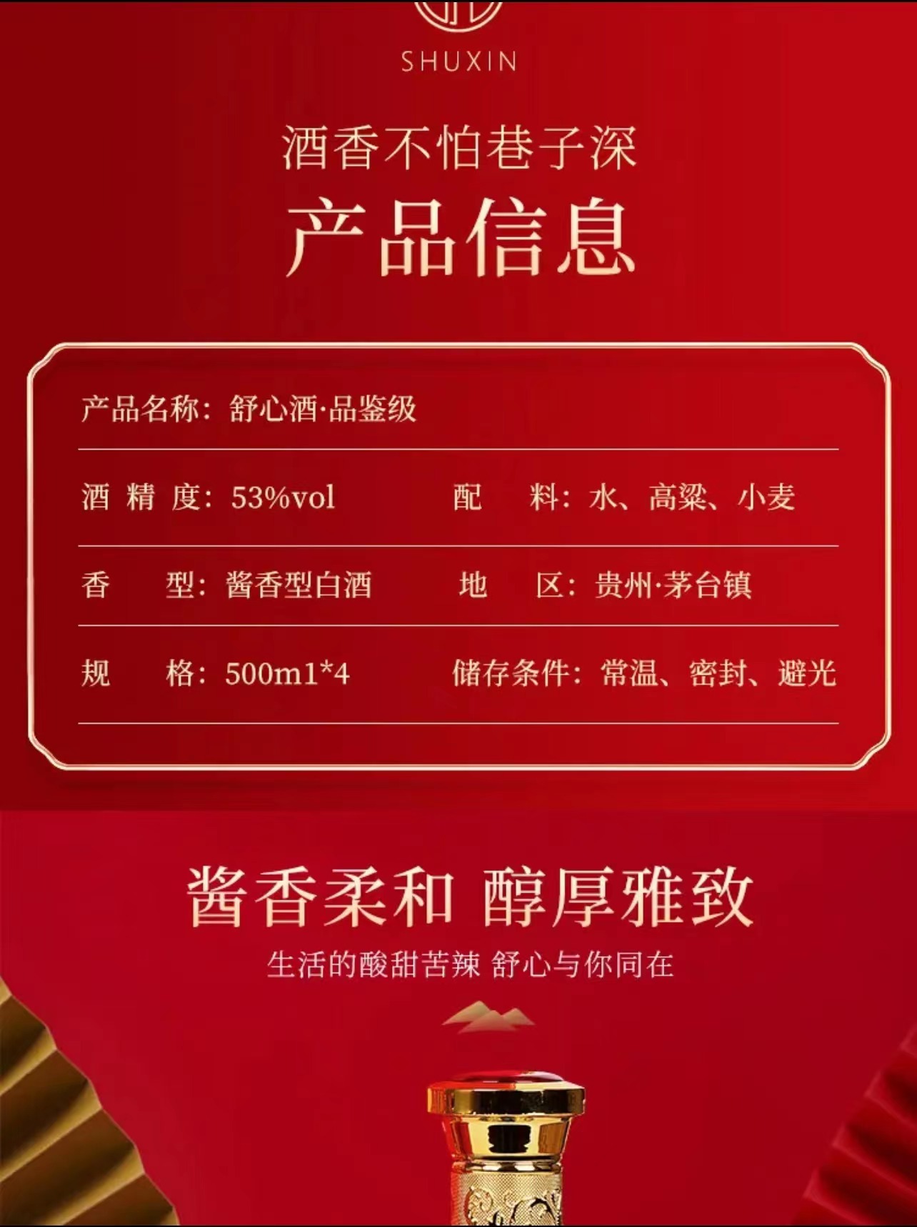 GJW 贵州茅台镇 53度 舒心酱酒 500ml*4 粮食酒 酱香型白酒 整箱装