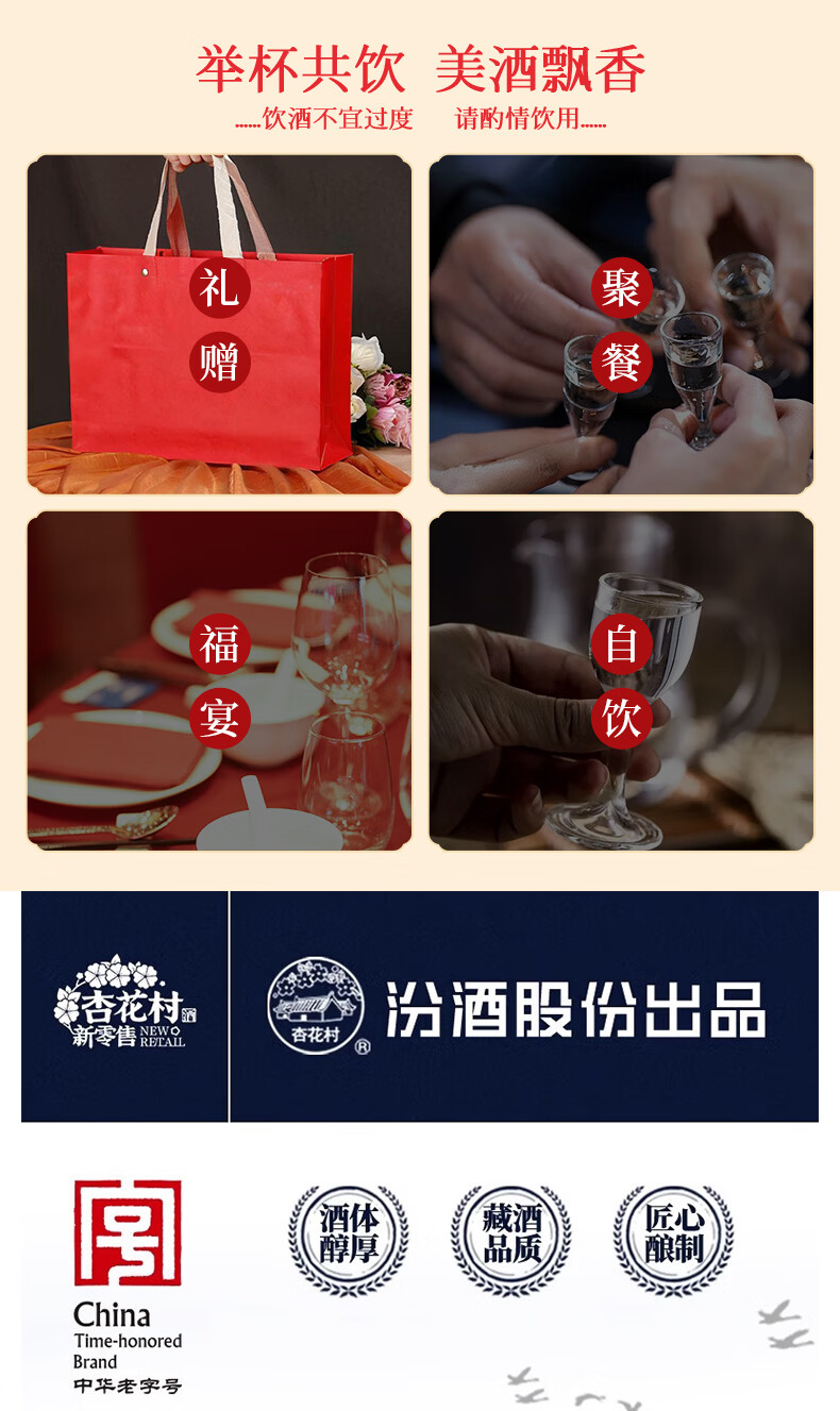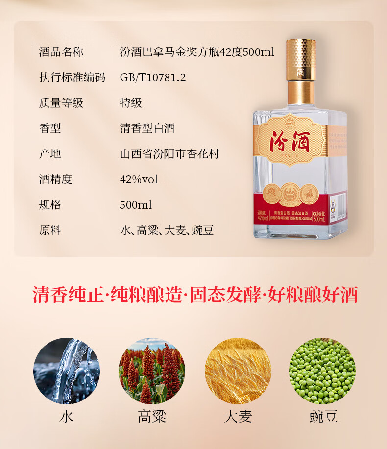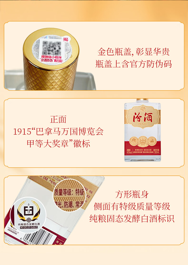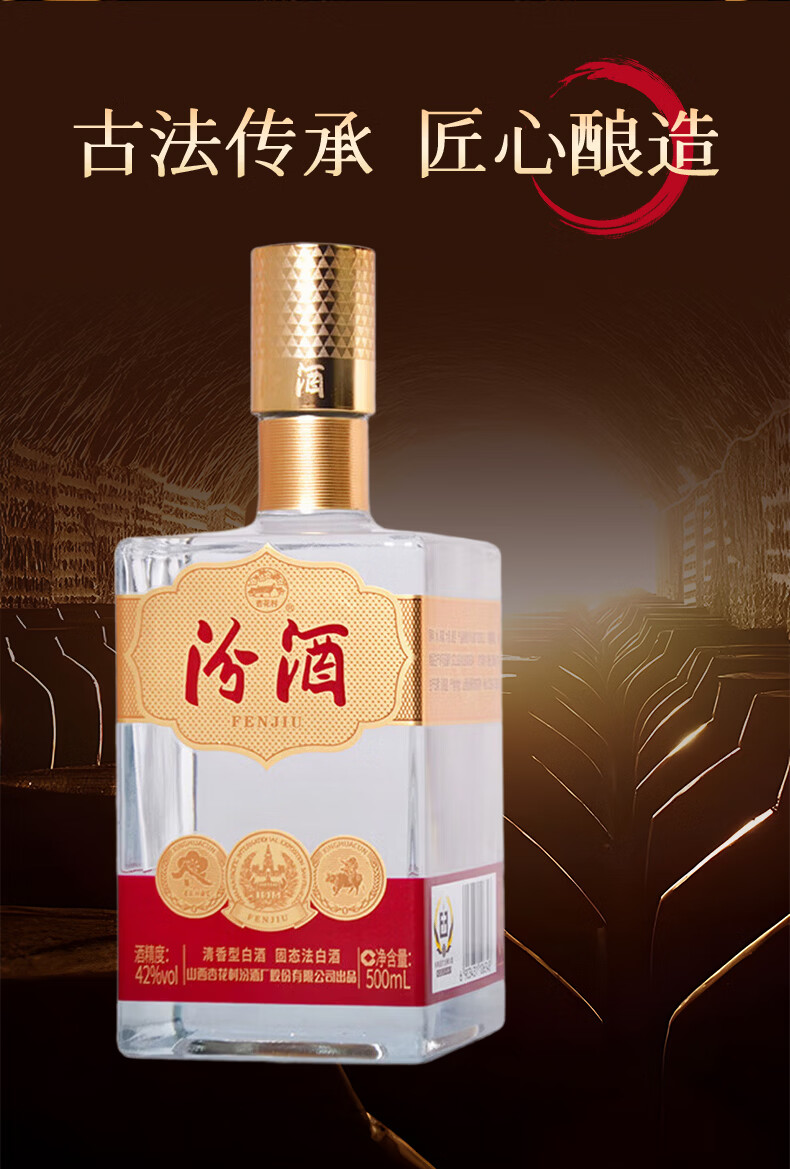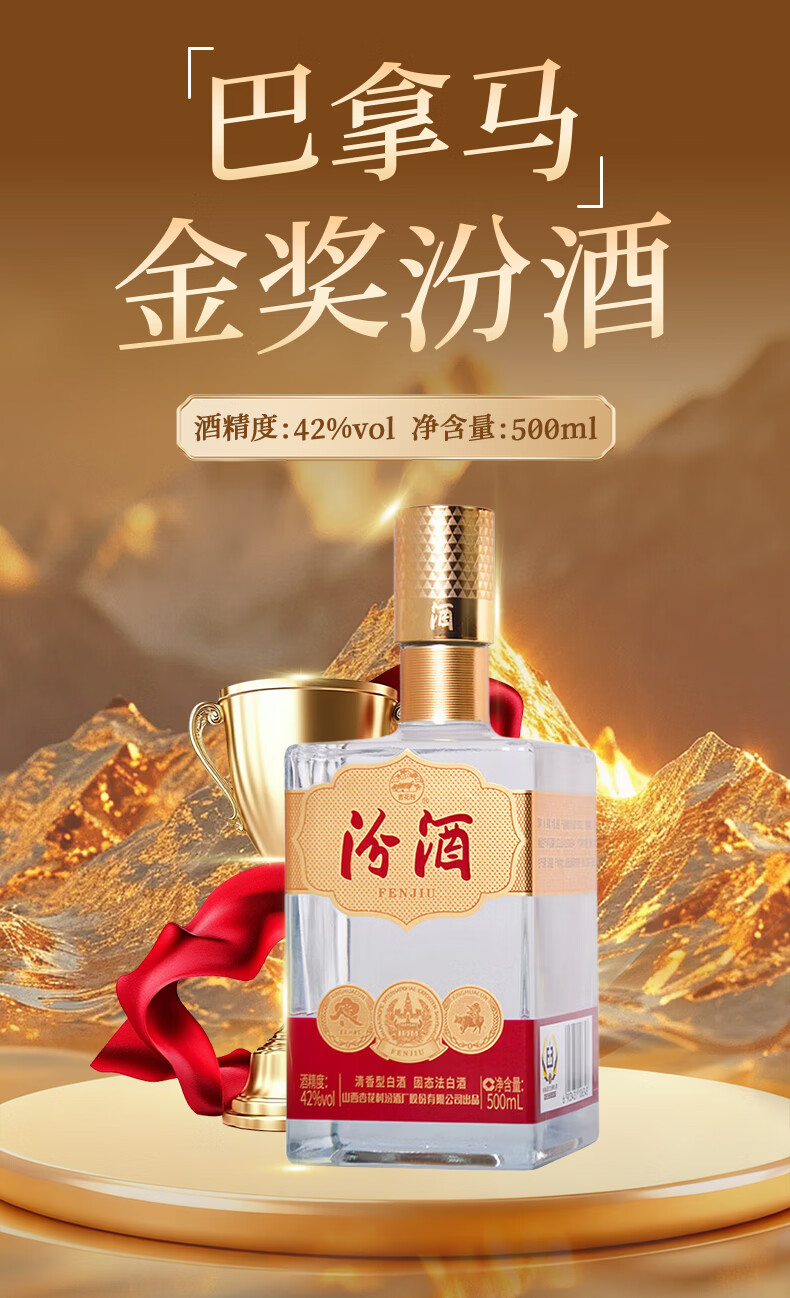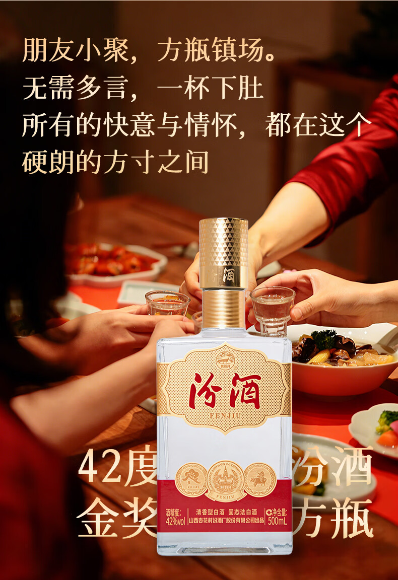汾酒巴拿马金奖小方瓶红 42度 清香型口粮酒白酒 500ml*6瓶 整箱装