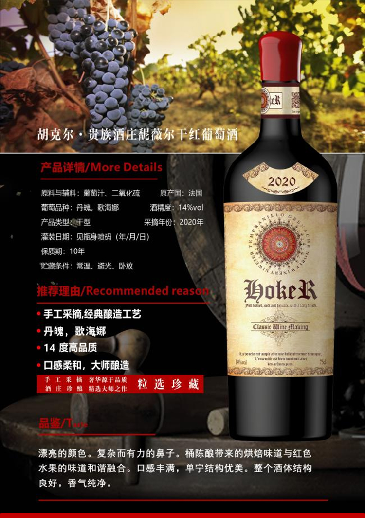 胡克尔 贵族酒庄馜薇尔干红葡萄酒 14%VOL 法国进口 750ml*6瓶 整箱装