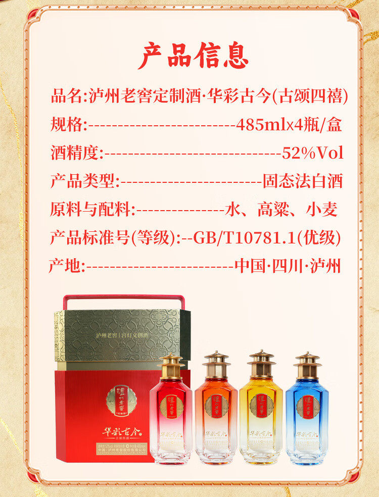泸州老窖定制酒华彩古今 古颂四禧 礼盒装 52度 浓香型白酒 收藏送礼 485ml*4瓶(盒)
