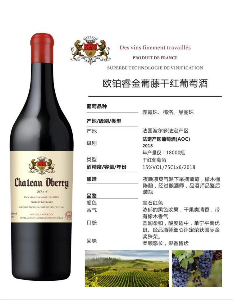 欧铂睿金葡藤干红葡萄酒 15%VOL 法国进口 750ml*6瓶 整箱装