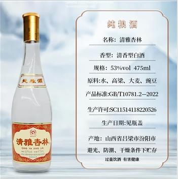 山西杏花村 杏铭泉 清雅杏林 清香型白酒 53度 475ml*12瓶 整箱