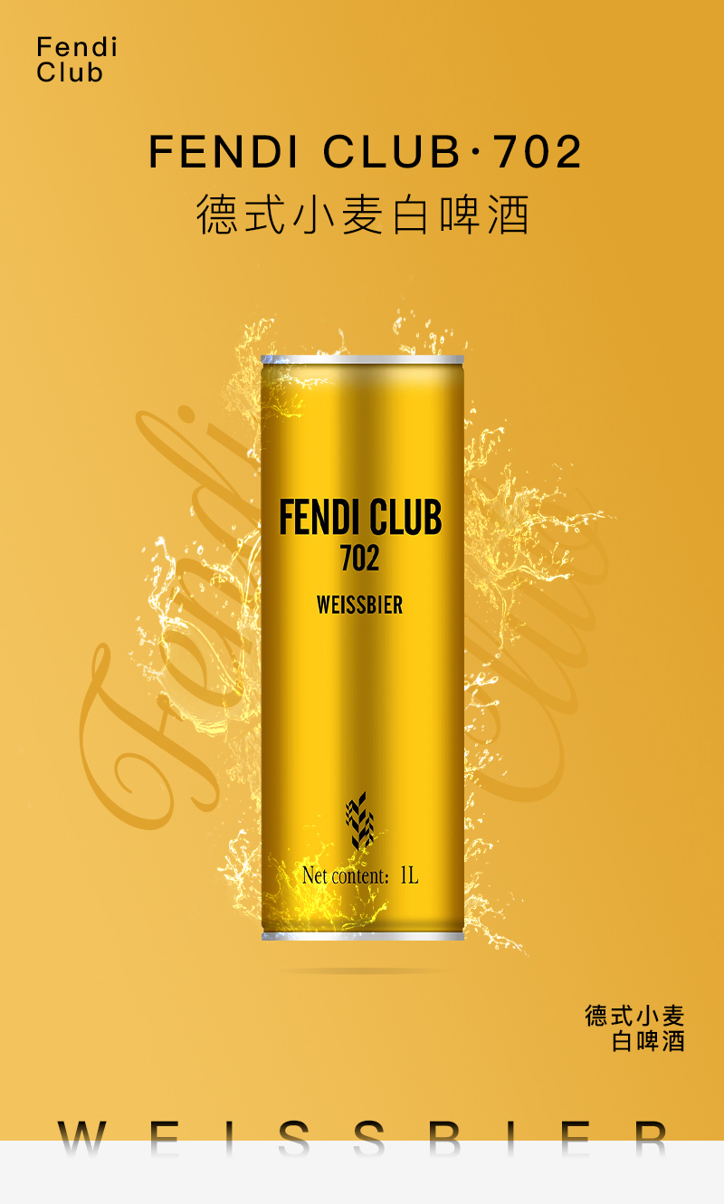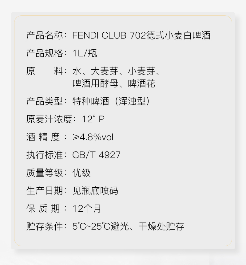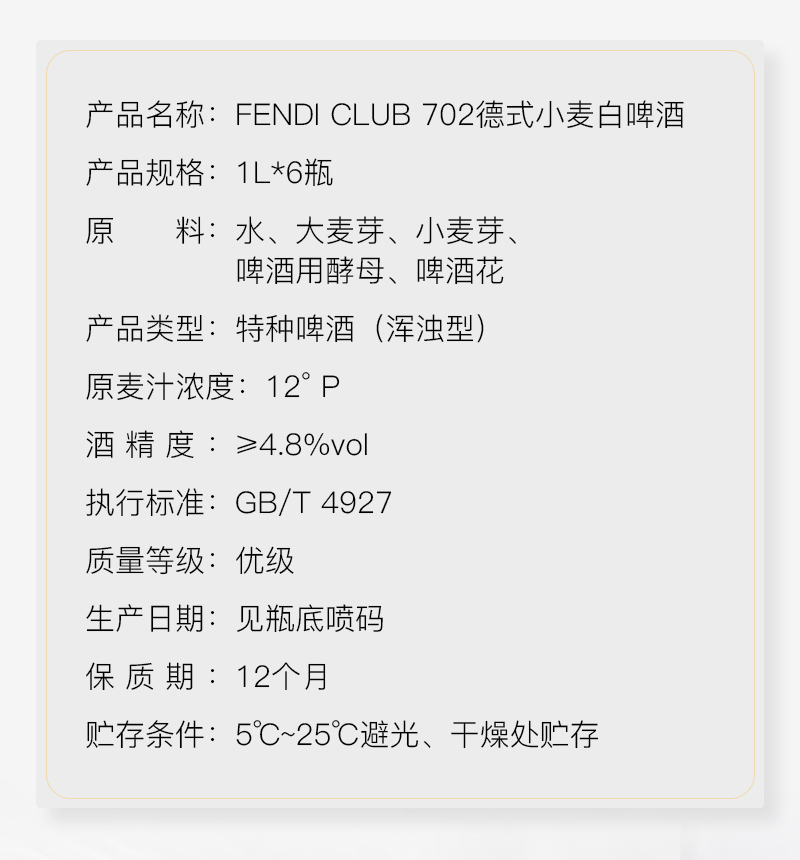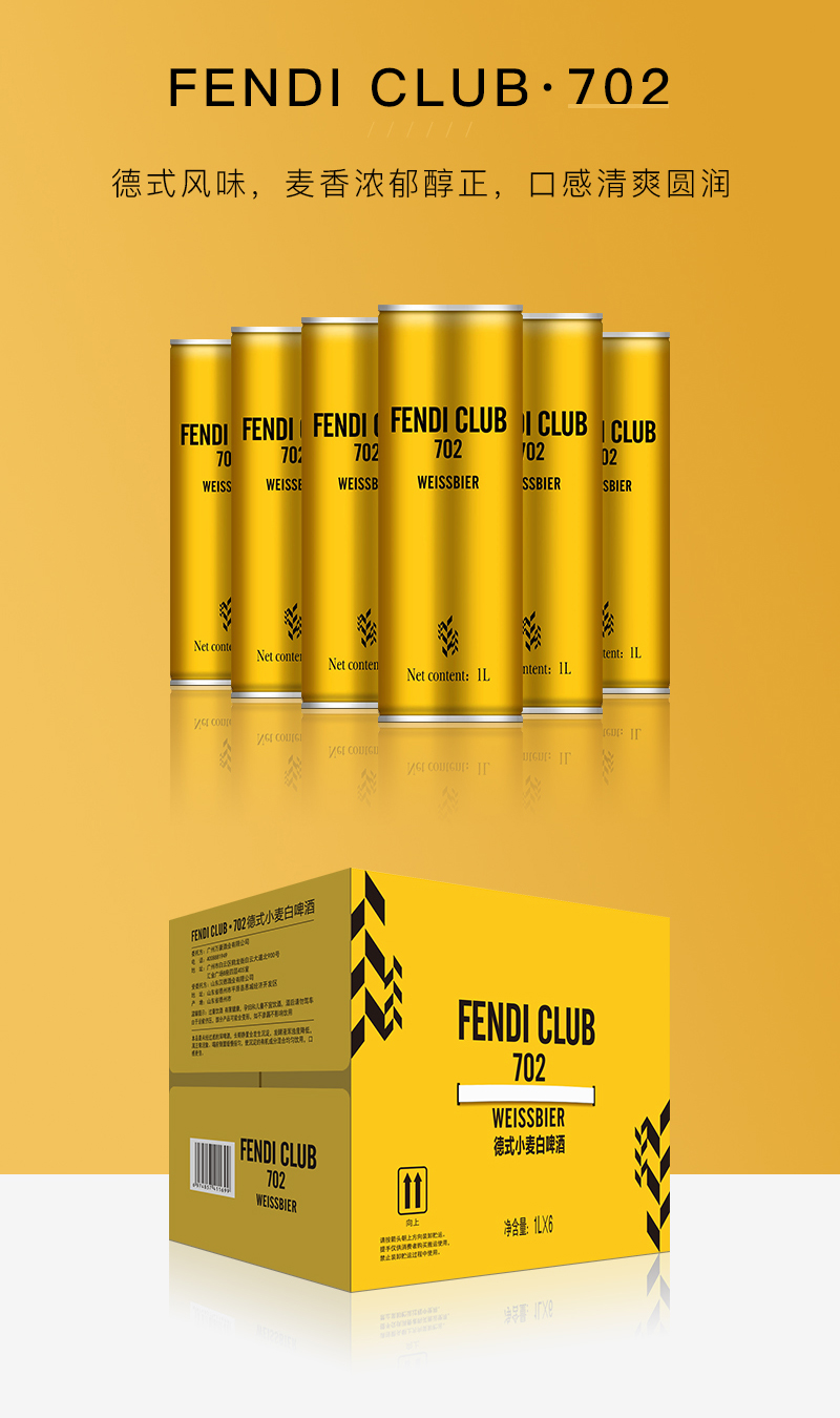 FENDI CLUB 702德式小麦白啤酒 原麦汁浓度12°P 酒精度≥4.8%VOL 1L*6瓶 整箱