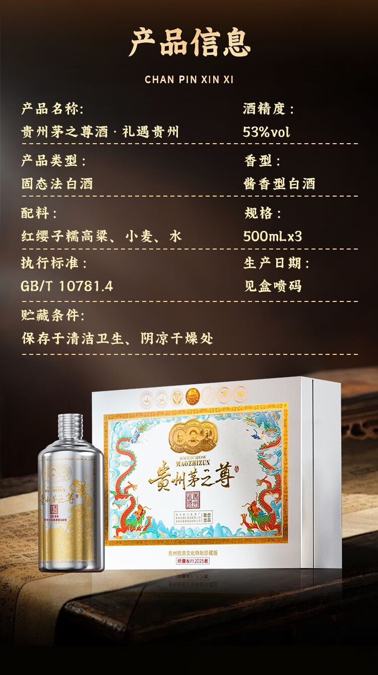 贵州茅之尊 礼遇贵州 53度 酱香型白酒 送礼收藏自饮 500ml*3瓶*1盒 整箱装