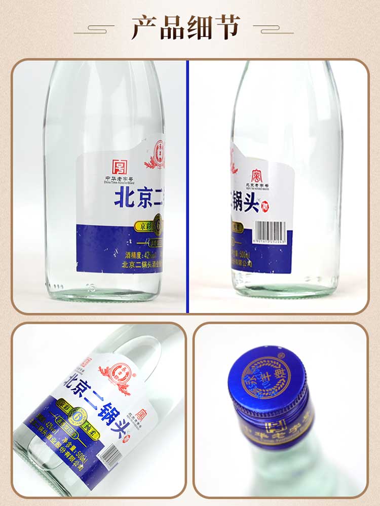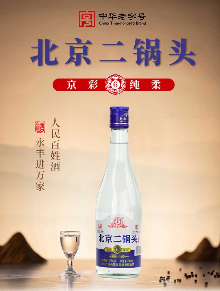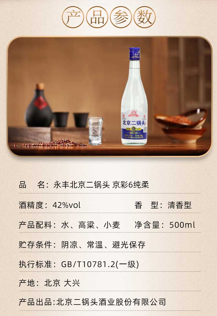 永丰北京二锅头 京彩6纯柔 42度 清香型白酒 纯粮酿造 光瓶 500ml*12瓶 整箱