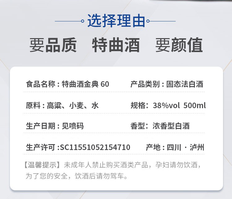 中国泸州頭曲股份有限公司出品 特曲酒 金典60 38度 浓香型白酒 纯粮固态发酵 500ml*6瓶 整箱