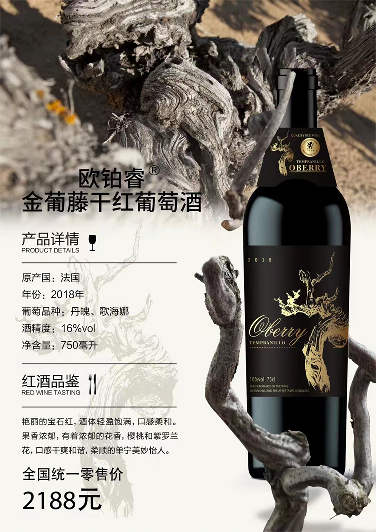 欧铂睿金葡藤干红葡萄酒 法国进口 16%VOL 750ml*6瓶 整箱装